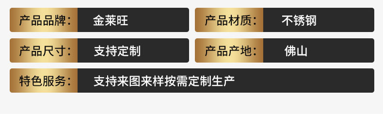 金莱旺不锈钢集生产加工、销售配送为一体,主要业务激光切割、剪、折、刨、各类不锈钢屏风,同时可根据客户要求进行定制各类不锈钢制品可加工和制作不锈钢系列产品:酒店不锈钢工程定制,不锈钢雕塑,背景墙,门套,线条,餐台支脚,展示架,时装架,等等不锈钢类五金。