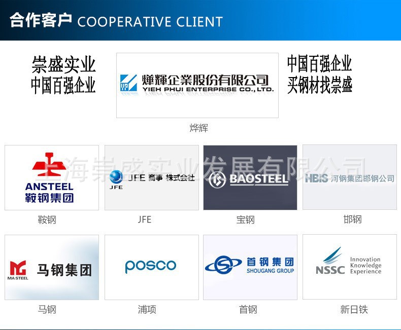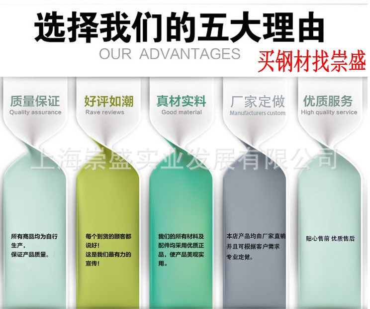 上海崇盛实业发展有限公司坐落于松江钢材,是城集钢铁贸易,仓储运输为一体的综合性企业。公司自备大型室内仓库,货源充足、资源全部现货供应(常年备有现货库存8万多吨)满足您日常的需求,特殊规格及材质均可按要求定做,交货期为一周左右。对现金购买的客户实行优惠,并送货上门.对于资质良好的客户.对需求量较大或者长期需要购买钢材的诚信企业可以垫资,可以周结、月结等灵活的结算方式。