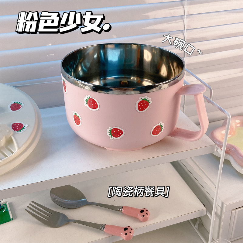 粉色草莓304不锈钢泡面碗大容量带盖可沥水学生宿舍饭碗上班饭盒