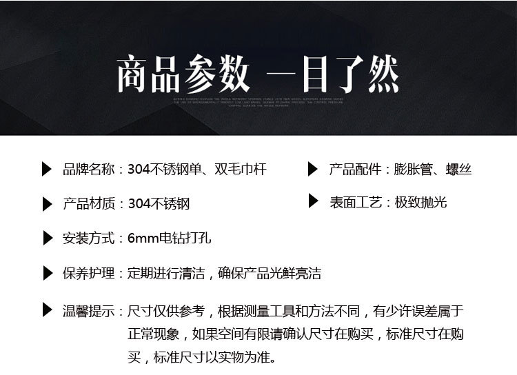 | 跨境304不锈钢纸巾架套装免打孔卫浴五金挂件毛巾架套装黑色单杆¥7.00成交6136笔 | 亚马逊跨境304不锈钢纸巾架厨房卷纸架保鲜膜收纳架免打孔橱柜¥11.50成交17011笔 | 跨境304不锈钢浴室毛巾架 免打孔毛巾杆黑色烤漆酒店卫生间浴巾架¥19.90成交2403笔 | ||