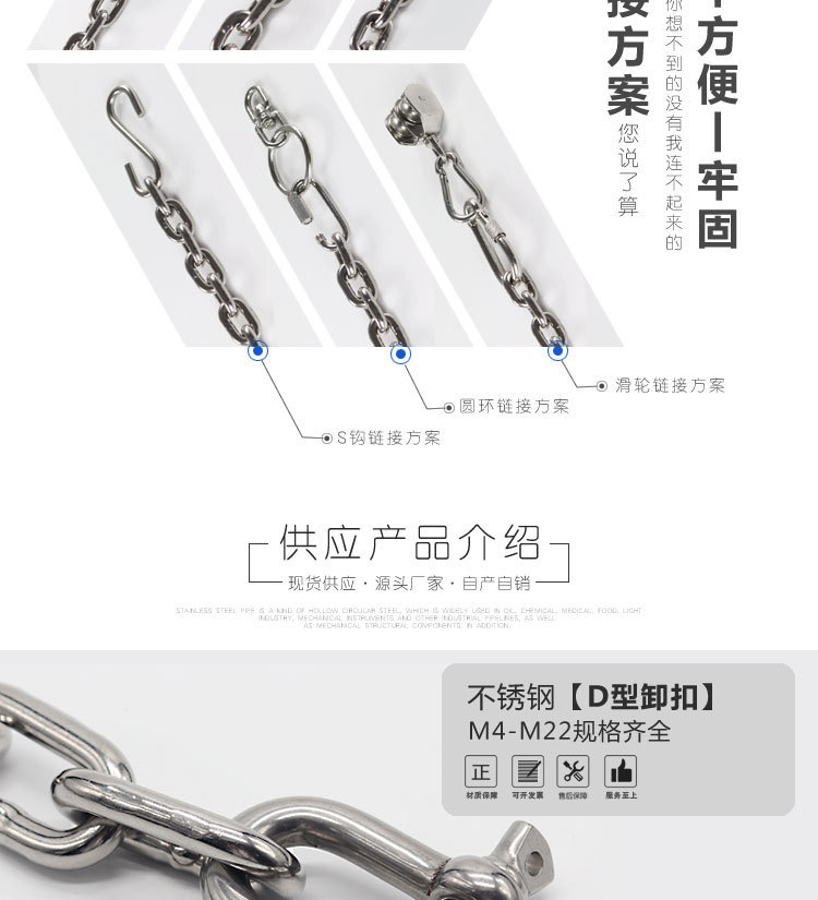 泰州市匠天不锈钢有限公司——以匠心品质,臻于至善为理念,以优良的服务及信誉、同行业极具竞争力的性价比羸得了各地区的新老客户的认可与信赖。公司主要生产经营的产品:紧固件、不锈钢索具、链条、连接件、钢丝绳及各类非标产品(来图来样订制)。公司以专业的技术,严谨的管理,超卓的设备,着力打造优质产品。