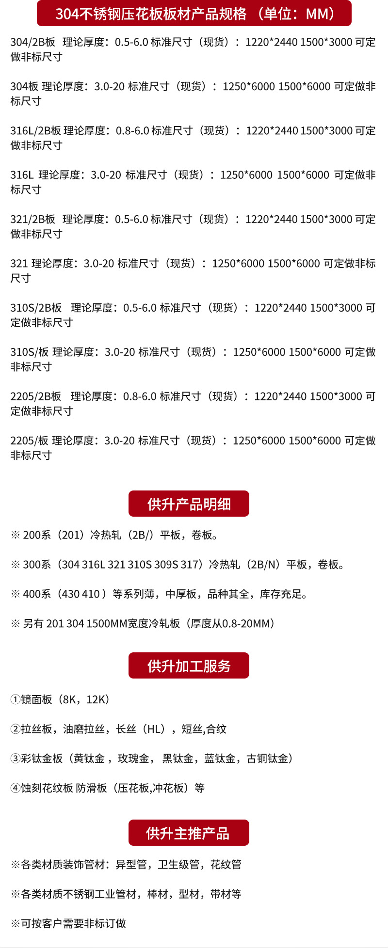 | 304不锈钢板 316/321镜面拉丝板高质量可切割高品质冷轧不锈钢板¥12.5 | 304不锈钢花纹板 201花纹板折边316 防滑花纹钢板 踏步板 花纹板¥10.9 | 厂家定制加工304不锈钢压花板不锈钢米粒花纹板扁豆圆点T型花纹板¥10 | ||