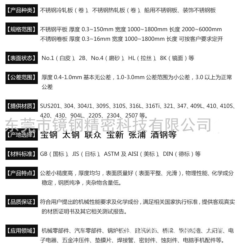 东莞市镜钢精密科技有限公司位于东莞市,是一家集金属贸易、销售、加工、仓存、配送于一身的企业,专营各国名牌金属材料的公司,材料均符合欧盟环保标准(ROHS),已通过了ISO9001:2000国际质量管理体系、中国船级社等认证。