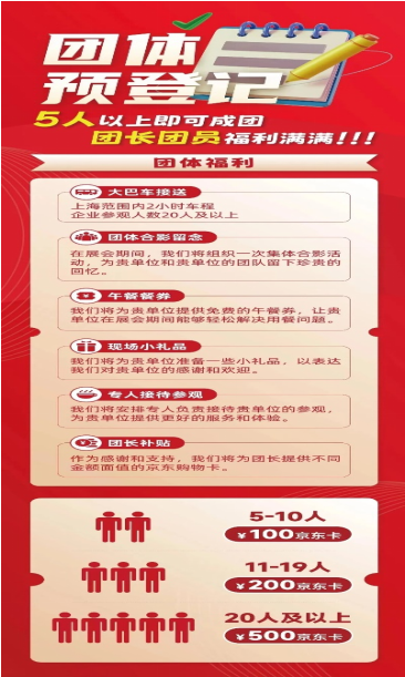我们为组团参观准备了大巴车接送、午餐、团长京东福利卡、现场礼品、留念合影等, 5人以上即可成团,人数越多、福利越多!