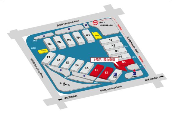 网约车/出租车:请定位“上海新国际博览中心3号入口大厅”下车(位于花木路与罗山路交叉口,或导航:上海新国际博览中心7号门)。