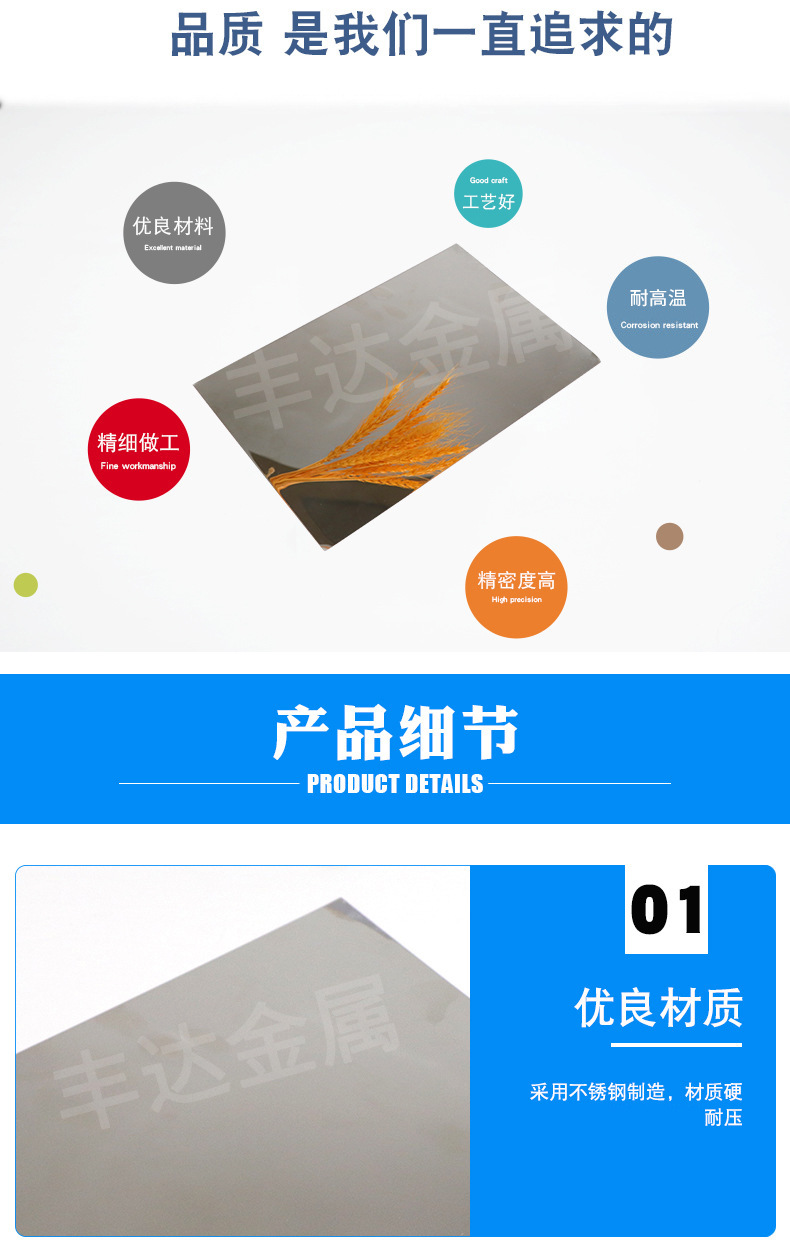 昆山丰达金属材料有限公司是一家加工,销售于一体的进口不锈钢带销售厂家。公司创办于2008年6月,位于昆山张浦镇。本公司以台湾,韩国,日本等国家和地区的原材为基础产品主要为SUS301《硬态1/4H 1/2H 3/4H H EH》 304《硬态1/2H 3/4H H》。镜面BA.8K.10K.14k.16k和喷沙面,镀镍镀锡不锈钢带430BA 3042B.316,420J2 厚度范围在0.01——2.0MM,宽度范围在2MM——600MM。包括各种牌号,硬度级别,表面状态的不锈钢带。产品质量按日本JIS质量标准严格控制。产品广泛适用于电子,电脑配件,五金玩具,文具等行业。产品类型包括不锈钢冲压硬料,弹簧钢带,高硬度的发条钢带,精密薄带等。本公司以薄利多销为原则,严把质量关,力争为广大客户提供优良快捷的材料厂供应服务。