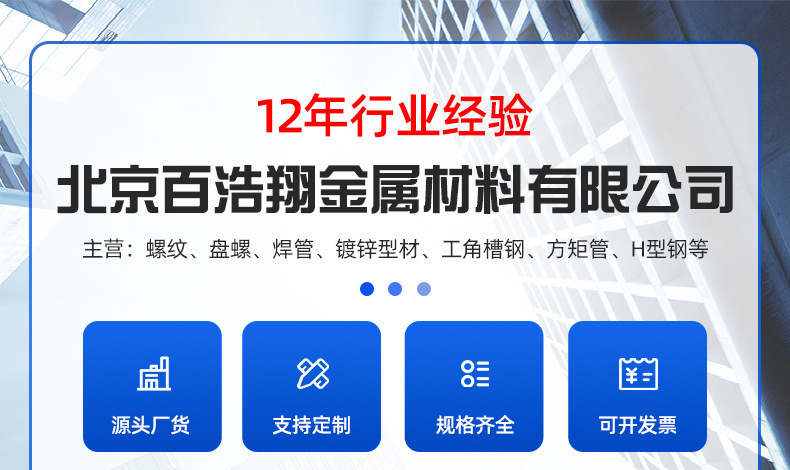北京百浩翔金属材料有限公司厂家直销,四大钢厂一级代理,螺纹、盘螺、焊管、镀锌型材、工角槽钢、方矩管、H型钢畅销消费者市场,在消费者当中享有较高的地位,公司与多家零售商和代理商建立了长期稳定的合作关系。北京百浩翔金属材料有限公司经销的螺纹、盘螺、焊管、镀锌型材、工角槽钢、方矩管、H型钢品种齐全、价格合理。