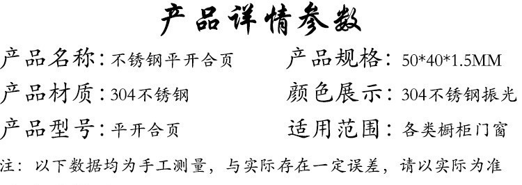 立即发布求购意向本网页所展示的有关【304不锈钢平开合页家具五金件柜门配件木门铰链2/3/4寸不锈钢合页_不锈钢附件/附件_佛山市悠耀五金制品有限公司】的信息/图片/参数等由鼎钢钢的会员【佛山市悠耀五金制品有限公司】提供,由鼎钢钢会员【佛山市悠耀五金制品有限公司】自行对信息/图片/参数等的真实性、准确性和合法性负责,本平台(本网站)仅提供展示服务,请谨慎交易,因交易而产生的法律关系及法律纠纷由您自行协商解决,本平台(本网站)对此不承担任何责任。您在本网页可以浏览【304不锈钢平开合页家具五金件柜门配件木门铰链2/3/4寸不锈钢合页_不锈钢附件/附件_佛山市悠耀五金制品有限公司】有关的信息/图片/价格等及提供【304不锈钢平开合页家具五金件柜门配件木门铰链2/3/4寸不锈钢合页_不锈钢附件/附件_佛山市悠耀五金制品有限公司】的商家公司简介、联系方式等信息。