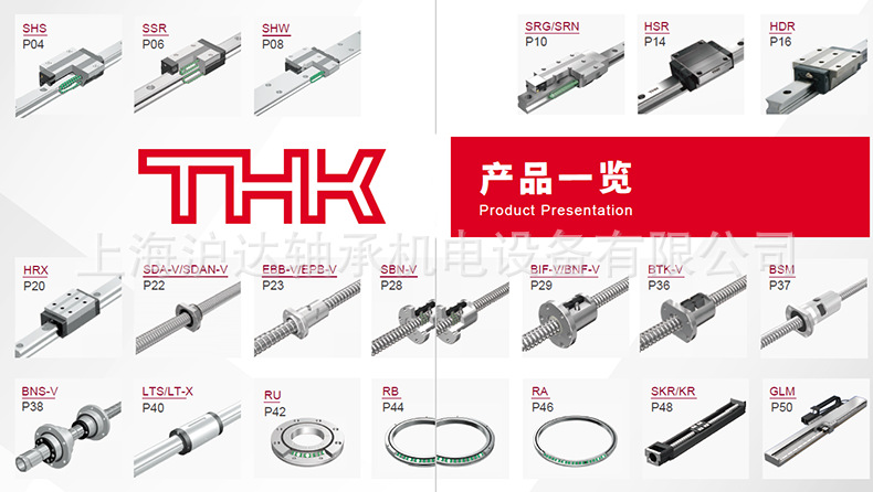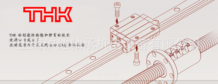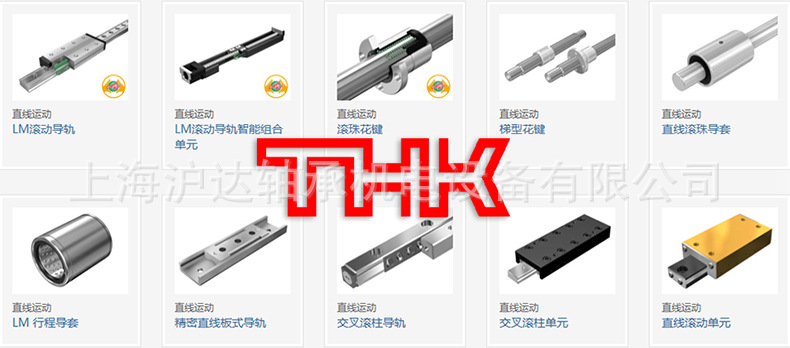 THK产品包括:THK导轨、滑块、THK LM滚动导轨智能组合单元,THK LM智能组合单元。滚珠花键、花键螺母,THK直线滚珠导套、THK直线轴承、直线轴、THK空心轴,精密板式导轨,THK交叉滚子导轨,交叉滚子轴承,THK精密滑台、精密模组、THK直线滚动单元,THK -LM滚柱滚动块,滚珠丝杆、丝杆螺母,滚针凸轮导向器、滚柱导向器,THK润滑油等产品。