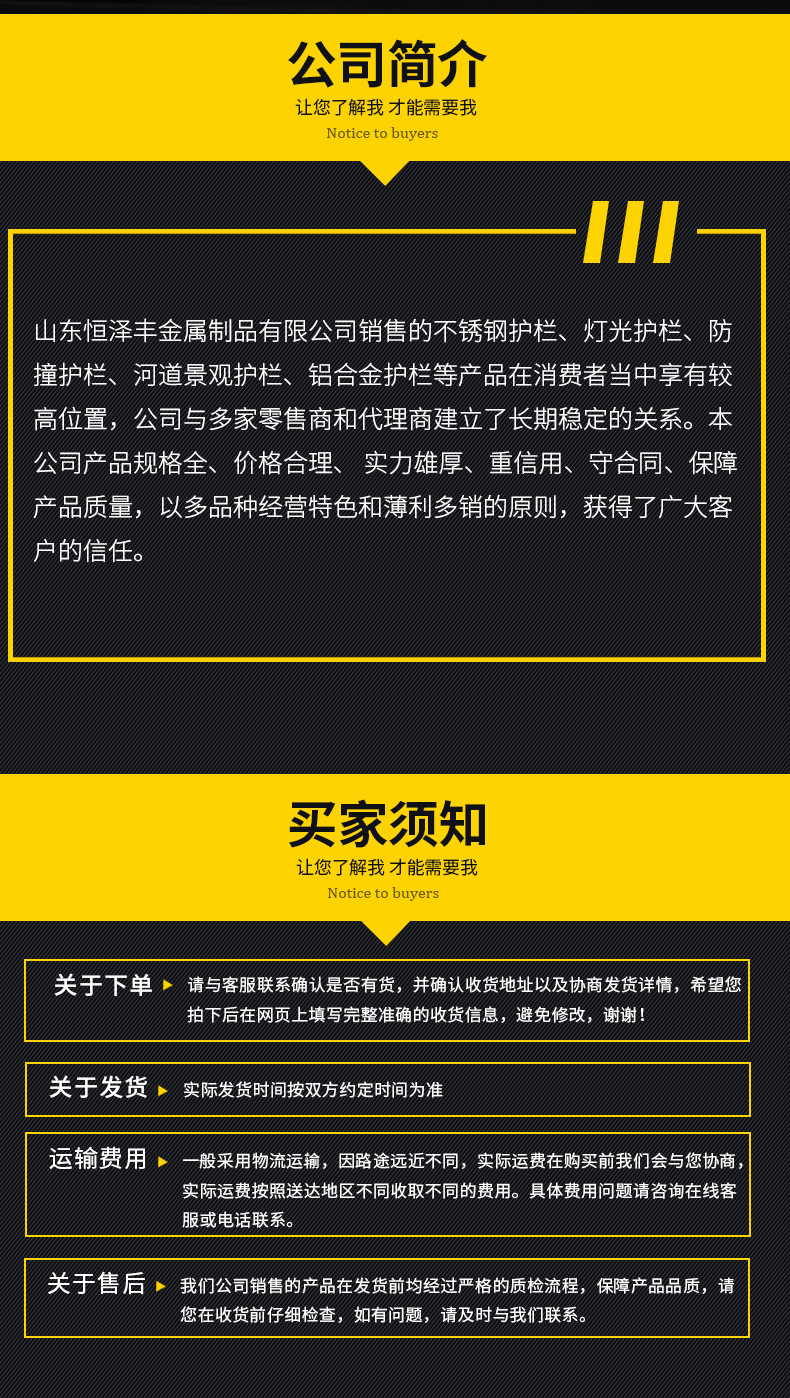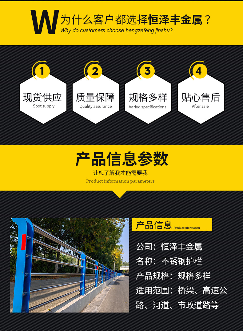 本网页所展示的有关【厂家制作不锈钢护栏 不锈钢复合管防护栏桥梁河道天桥道路栏杆_不锈钢护栏_山东恒泽丰金属制品有限公司】的信息/图片/参数等由鼎钢钢的会员【山东恒泽丰金属制品有限公司】提供,由鼎钢钢会员【山东恒泽丰金属制品有限公司】自行对信息/图片/参数等的真实性、准确性和合法性负责,本平台(本网站)仅提供展示服务,请谨慎交易,因交易而产生的法律关系及法律纠纷由您自行协商解决,本平台(本网站)对此不承担任何责任。您在本网页可以浏览【厂家制作不锈钢护栏 不锈钢复合管防护栏桥梁河道天桥道路栏杆_不锈钢护栏_山东恒泽丰金属制品有限公司】有关的信息/图片/价格等及提供【厂家制作不锈钢护栏 不锈钢复合管防护栏桥梁河道天桥道路栏杆_不锈钢护栏_山东恒泽丰金属制品有限公司】的商家公司简介、联系方式等信息。