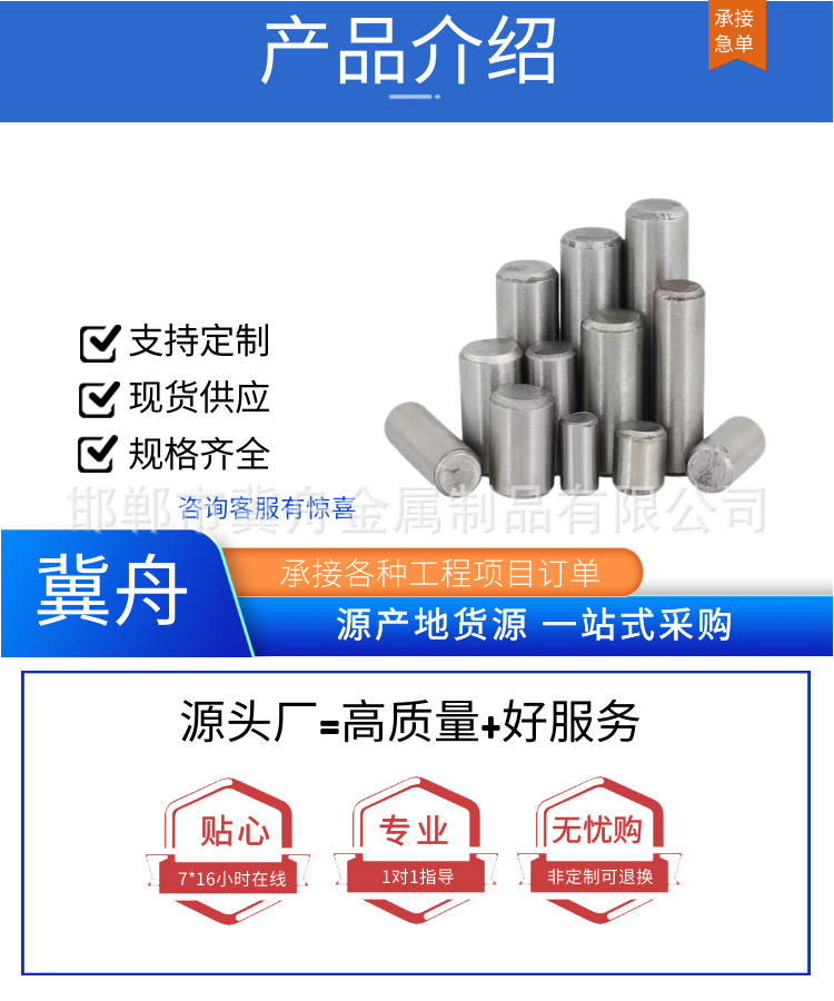 本网页所展示的有关【厂家批发 不锈钢两头倒角圆柱销钉 圆柱销轴 碳钢实心定位_不锈钢制品_邯郸市冀舟金属制品有限公司】的信息/图片/参数等由鼎钢钢的会员【邯郸市冀舟金属制品有限公司】提供,由鼎钢钢会员【邯郸市冀舟金属制品有限公司】自行对信息/图片/参数等的真实性、准确性和合法性负责,本平台(本网站)仅提供展示服务,请谨慎交易,因交易而产生的法律关系及法律纠纷由您自行协商解决,本平台(本网站)对此不承担任何责任。您在本网页可以浏览【厂家批发 不锈钢两头倒角圆柱销钉 圆柱销轴 碳钢实心定位_不锈钢制品_邯郸市冀舟金属制品有限公司】有关的信息/图片/价格等及提供【厂家批发 不锈钢两头倒角圆柱销钉 圆柱销轴 碳钢实心定位_不锈钢制品_邯郸市冀舟金属制品有限公司】的商家公司简介、联系方式等信息。