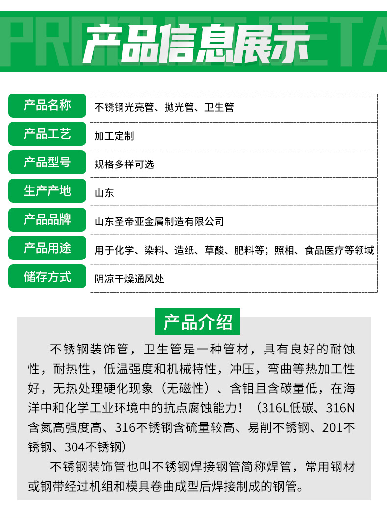 本网页所展示的有关【不锈钢管 201/304/316不锈钢圆管 装饰管抛光拉丝303不锈钢装饰管_不锈钢圆管_山东圣帝亚金属制造有限公司】的信息/图片/参数等由鼎钢钢的会员【山东圣帝亚金属制造有限公司】提供,由鼎钢钢会员【山东圣帝亚金属制造有限公司】自行对信息/图片/参数等的真实性、准确性和合法性负责,本平台(本网站)仅提供展示服务,请谨慎交易,因交易而产生的法律关系及法律纠纷由您自行协商解决,本平台(本网站)对此不承担任何责任。您在本网页可以浏览【不锈钢管 201/304/316不锈钢圆管 装饰管抛光拉丝303不锈钢装饰管_不锈钢圆管_山东圣帝亚金属制造有限公司】有关的信息/图片/价格等及提供【不锈钢管 201/304/316不锈钢圆管 装饰管抛光拉丝303不锈钢装饰管_不锈钢圆管_山东圣帝亚金属制造有限公司】的商家公司简介、联系方式等信息。
